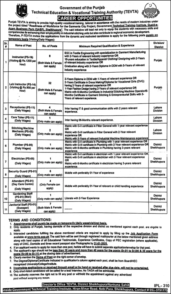 Punjab Technical Education & Vocational Training Authority invites applications for various positions on a temporary/daily wage/visiting basis as part of the project titled “Readiness of Workforce for the Garments City Project” at the Government Technical Training Institute, Quaid-e-Azam Business Park (QABP), Sheikhupura. This initiative aims to provide high-quality vocational training aligned with modern industrial requirements, fostering economic development and enhancing employability.